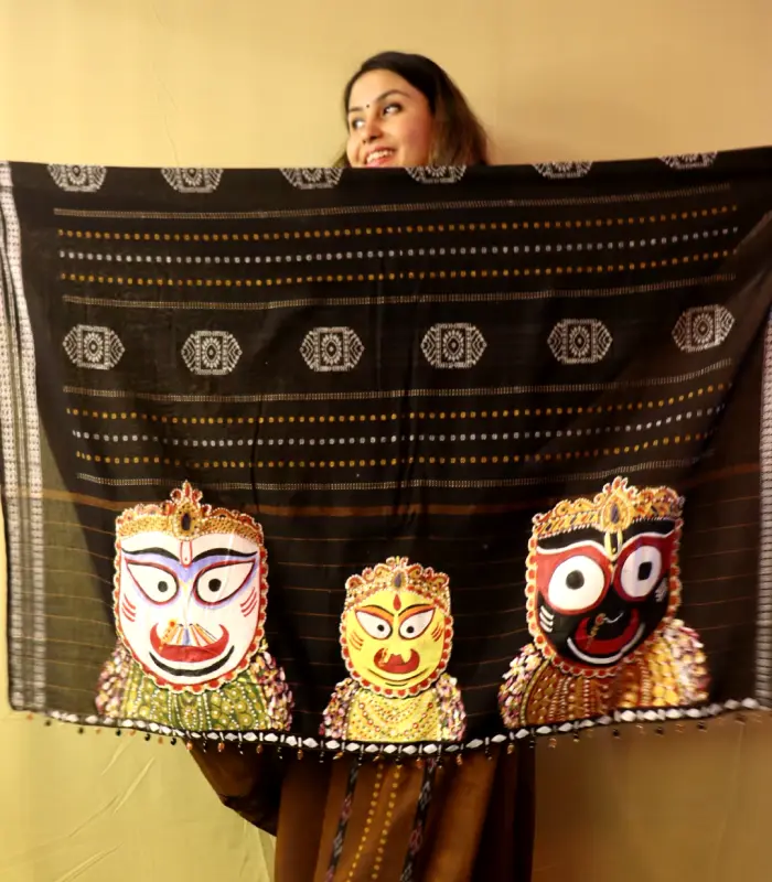 Their skilled artisans meticulously hand-paint the Jagannath Ji design, ensuring each saree is a one-of-a-kind masterpiece.