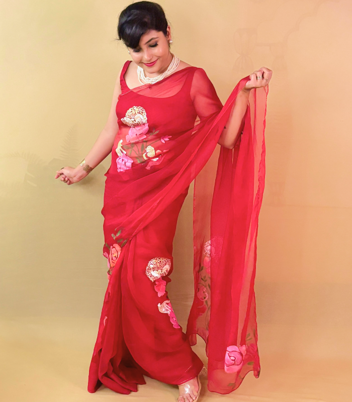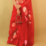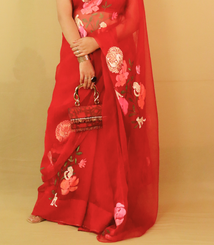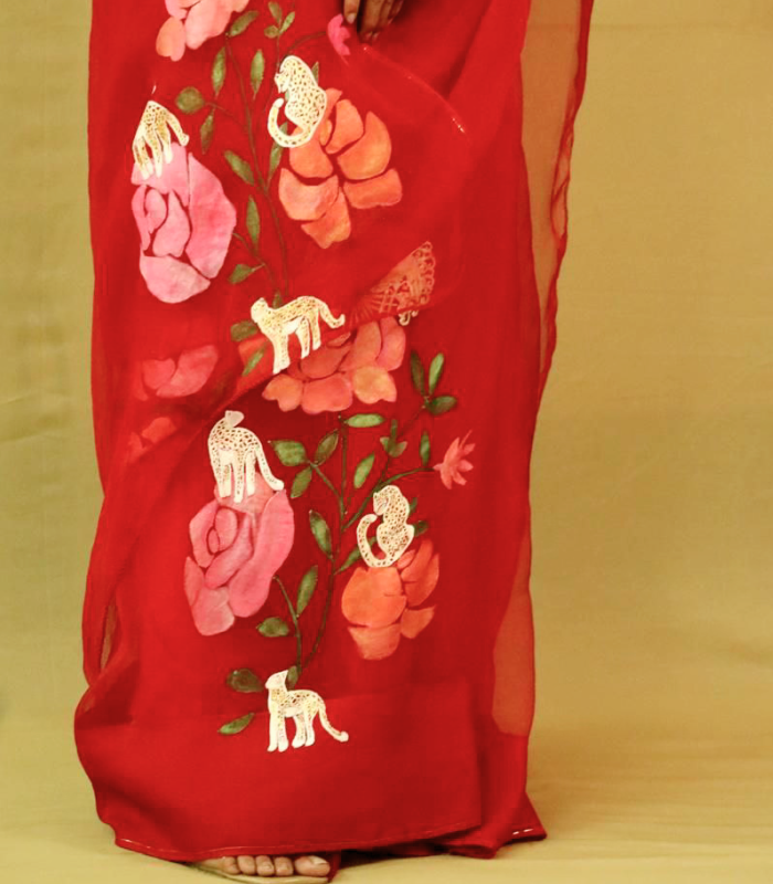 Our RED JUNGLE SAREE is adored for its delicate pattern and balance trend with shophistication .This captivating design features artistic play with FLORA & FAUNA.